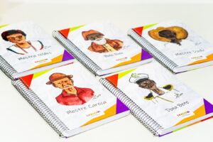 Os cadernos de dez matérias e de desenho apresentam, em suas capas, os rostos dos mestres Bule-Bule, Dadu, Bete, Careca e da Mestra Nildes (in memoriam) – figuras fundamentais da memória e da oralidade local, responsáveis por preservar e dar continuidade ao patrimônio imaterial de Camaçari.